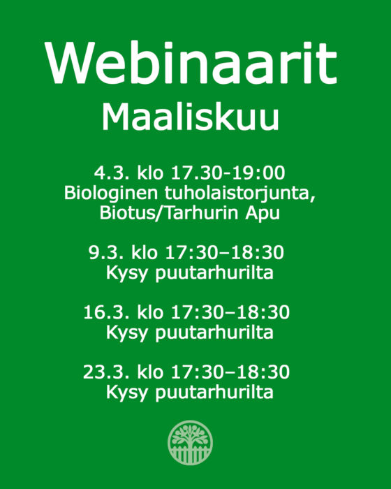 Puutarhaliiton maaliskuun webinaarit Posted on 2 maaliskuun, 20262 maaliskuun, 2026 by Hanna Webinaarilinkit on lähetetty jäsenille sähköpostilla. Lisätietoja: Mikkelin Puutarhayhdistys ry hallitus@mikkelinpuutarhayhdistys.fi