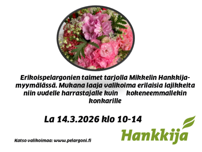 Pelargonipäivä la 14.3.2026 klo 10 -14 Hankkijalla, Laiturikatu 4, Mikkeli