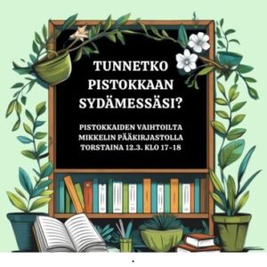 Onko ikkunoillesi kertynyt kevään aikana saksittujen kasvien pistokkaita? Tuo ne kirjastolle vaihtoon, samalla saat kasvitietoa ja apua pistokkaiden tunnistamiseen. Tapahtumassa ovat mukana Kukkakauppa Neiti Neilikka, Mikkelin Puutarhayhdistys ry ja Huonekasviseura ry. Pistokkaasi voi olla …